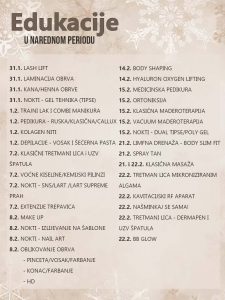 NOVI CIKLUS EDUKACIJA31.1. Lash lift - 160 KM31.1. Laminacija (brow lift) obrva – 160 KM31.1. Kana (Henna) obrve - 160 KMCijena za obje...